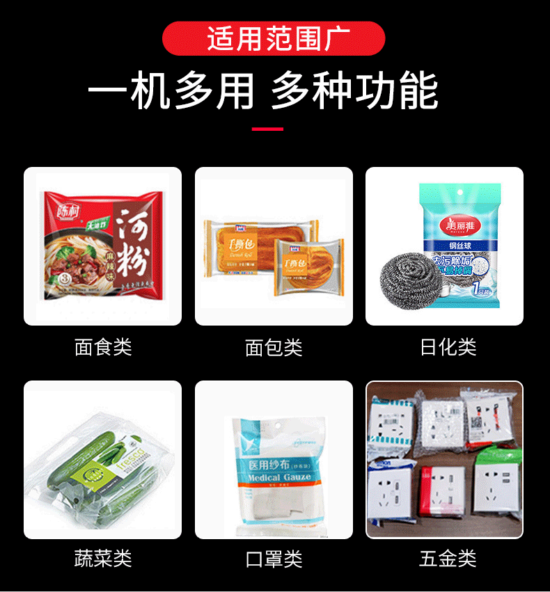 適用于包裝各類固體有規(guī)則的大型塊狀物料,如餅干、面包、速凍食品類以及日用品、工業(yè)零件等。對分散狀物料則需將被包物先置于盒內(nèi),使之形成一個(gè)有規(guī)則的整體,才可包裝。 廣泛應(yīng)用于食品制藥·五金日化等行業(yè)!