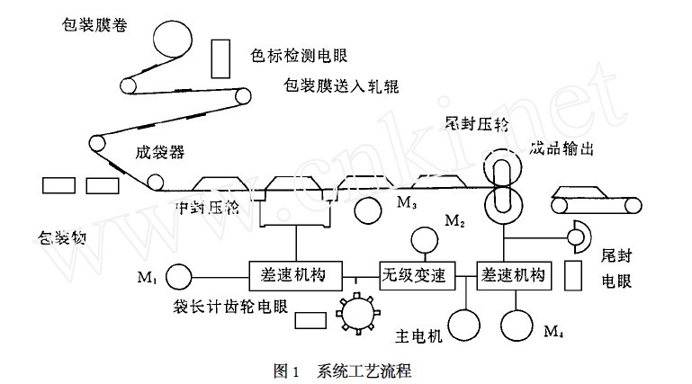 枕式包裝機(jī)系統(tǒng)的工藝流程示意圖如圖1。包裝物通過傳送帶(系統(tǒng)圖的左端) 進(jìn)入成袋器, 成袋器